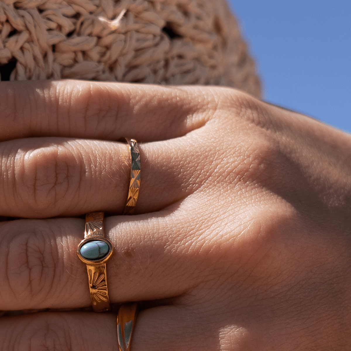 The Sunray Stacking Ring is your new go-to. Delicate and minimal with a sunburst engraving, it’s designed to catch the light just right. Wear it solo for understated shine or stack it up to build your own golden hour moment. Waterproof, tarnish-free and made for everyday wear.