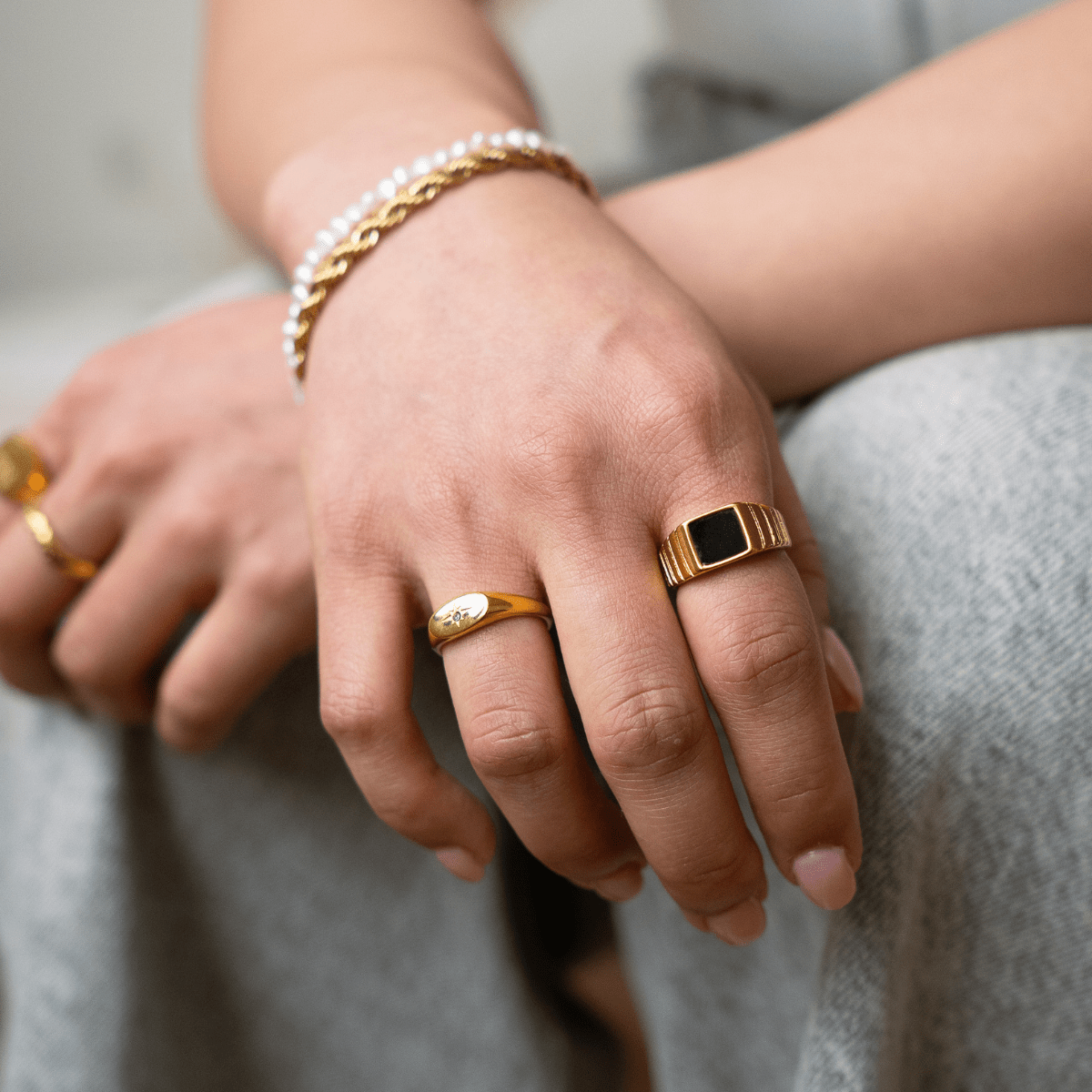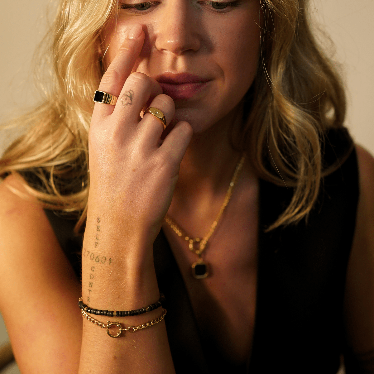 Black & gold - the perfect colour combo! Our Midnight Signet Ring is a modern twist on a classic. Whether you’re dressing it up or wearing solo, it's the perfect addition to your collection to add a little edge to your everyday look.