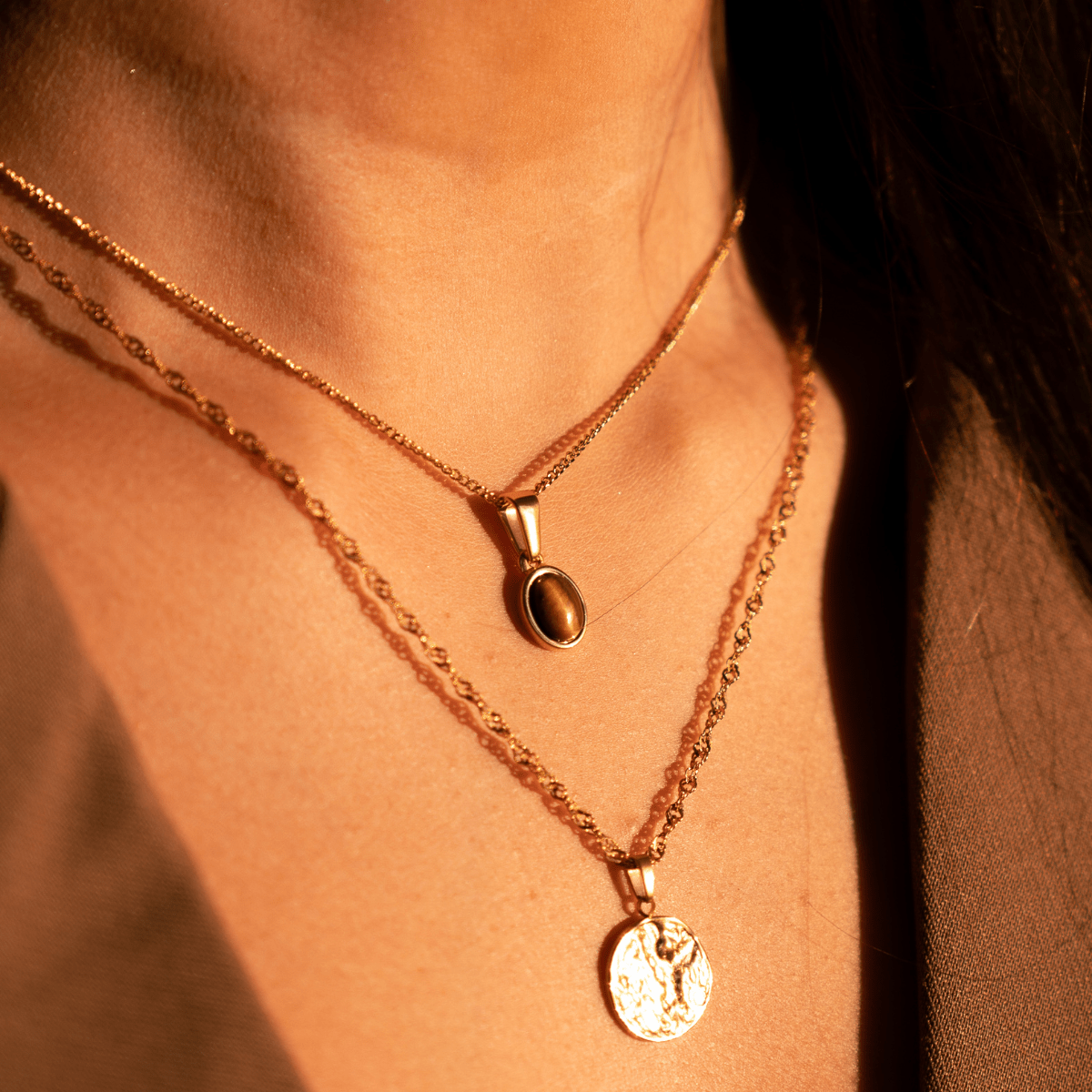 The Tiger’s Eye Charm Necklace features a rich, earthy stone known for its natural depth and warmth. Each piece is unique, making every charm one of a kind. Perfect for adding a grounded, statement touch to your chain.