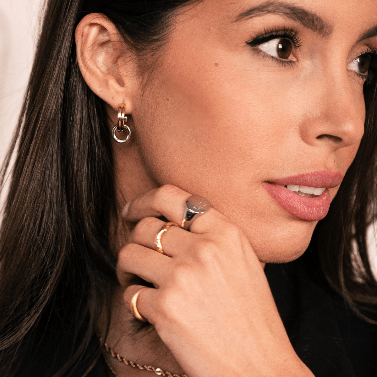 A bold, chunky mixed metal hoop designed with a removable ring detail that completely transforms your look. Wear them as a clean, everyday hoop or add the outer ring for a layered, statement feel.